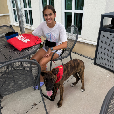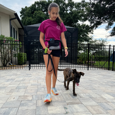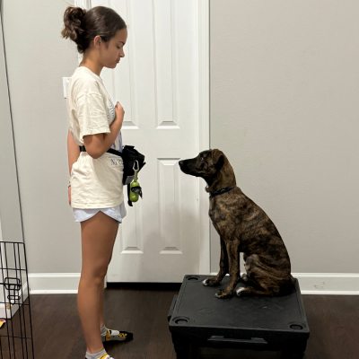 During the camp day, Dolan is learning crate exercises. These exercises teach him to not run out of the crate and when the proper time to leave the crate is. Dolan is also excelling at loose leash walking. This helps him not pull on the leash and to stay walking on the left side.