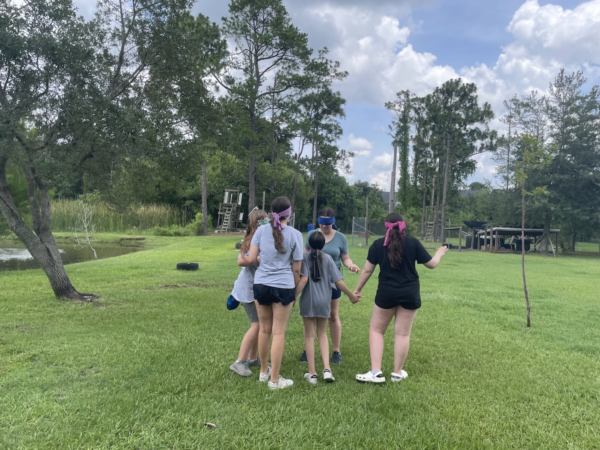 Nature Play is an expansive field full of ponds, sand hills, and a mini forest. Many of the campers teamed up and held hands trying to find their way across without falling in the pond or walking into a tree.