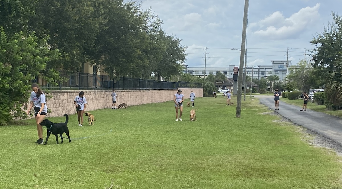 Then the campers took their dogs out to the grass strip to continue working on loose leash walking and get them some morning exercise. The dogs were able to experience the light rain while the campers worked with them.